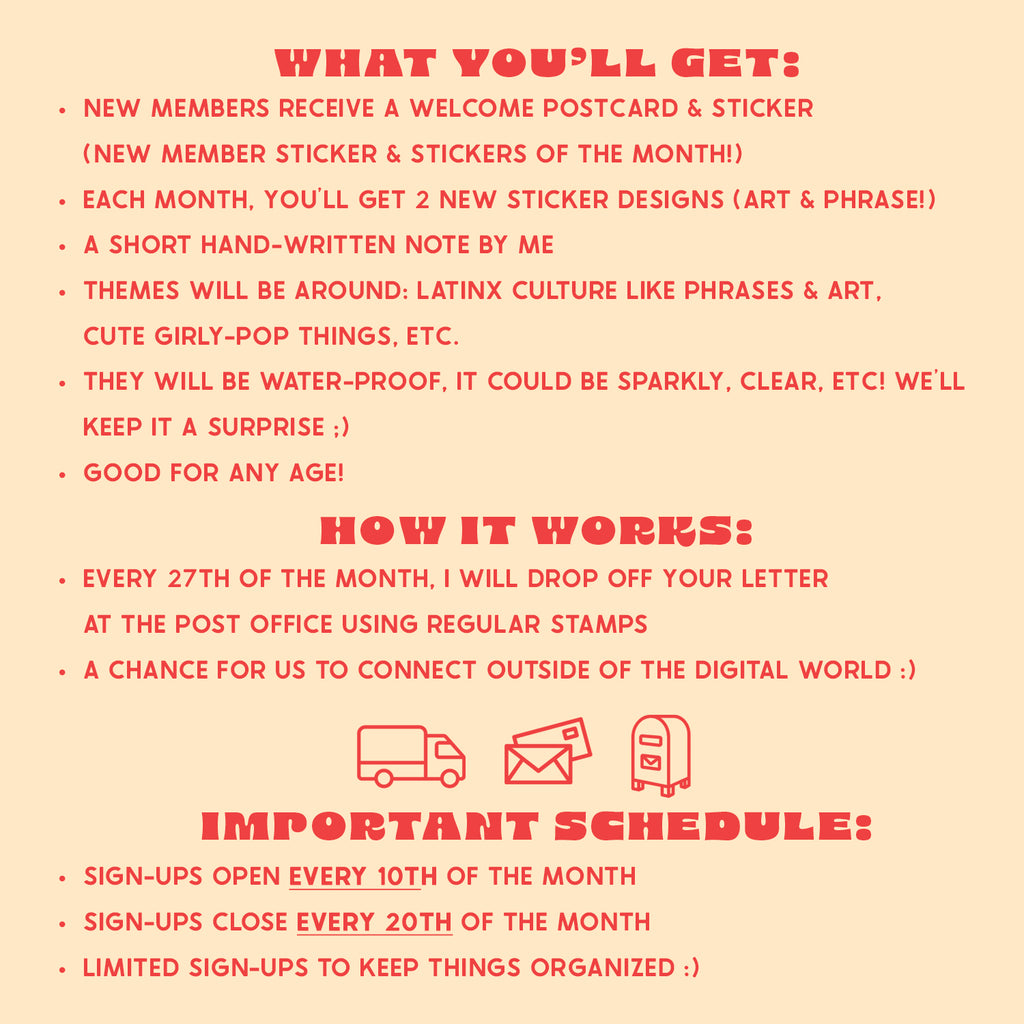 Exclusive new members will receive a welcome postcard, welcome sticker, and the 2 stickers of the month! (so, 4 items total for new members)